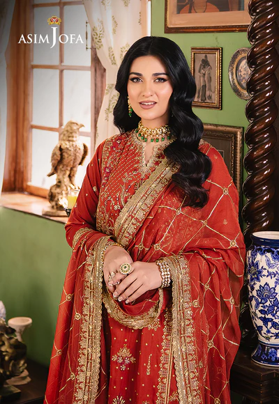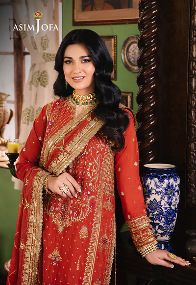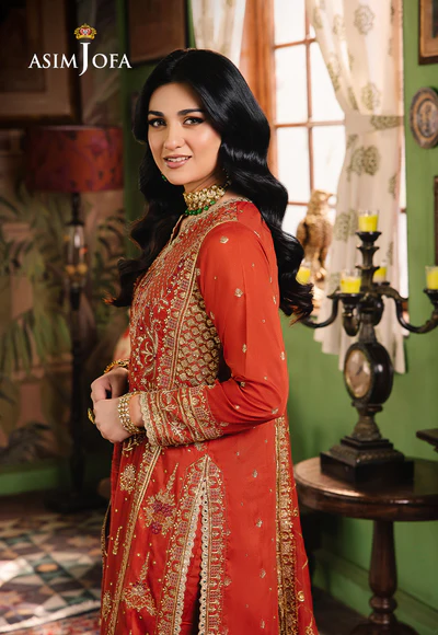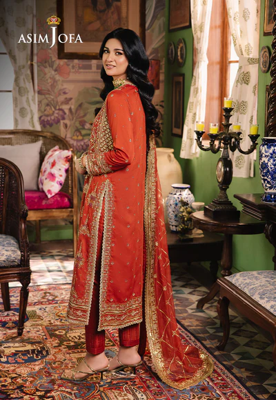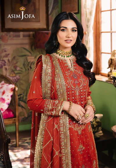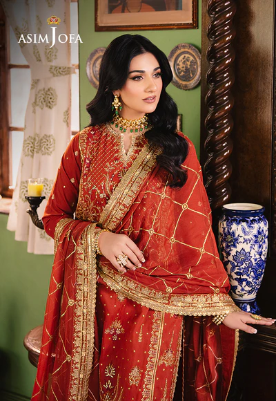 Embrace the warmth of a desert sunset with this fiery rust ensemble. The rust-colored shirt, reminiscent of a glorious dusky sky, is beautifully embroidered featuring gold zari work mingling with beige and maroon threads, artfully embellished by cupped gold sequins to evoke glittery essence of the outfit. The flowy dupatta, embroidered in a geometric pattern, echoes the color palette, creating a look that is both artistic and beautiful.